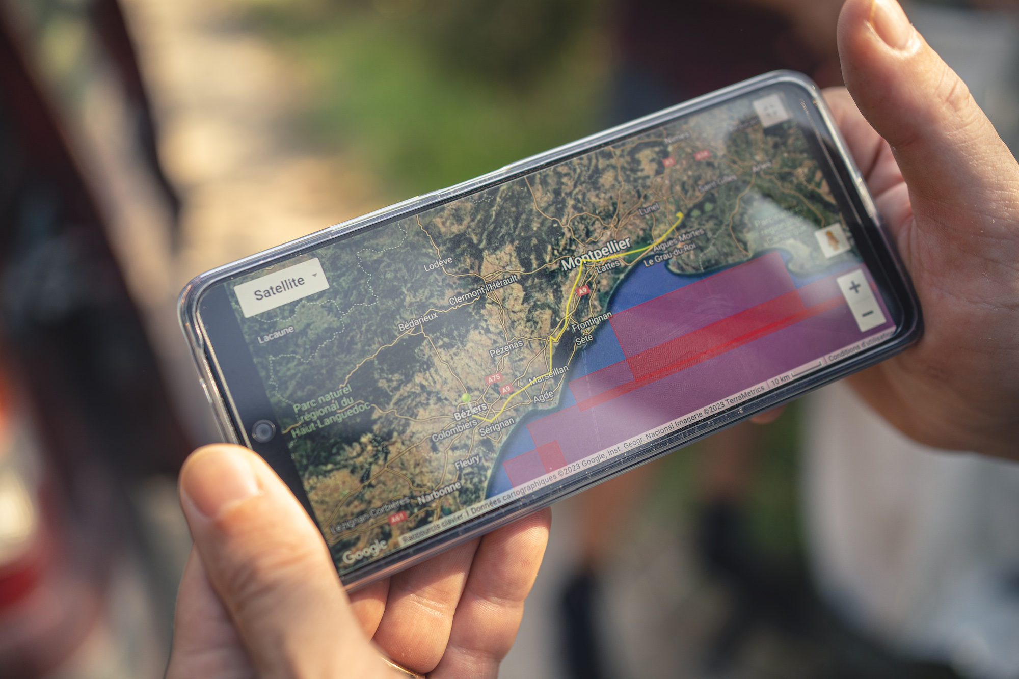 France, Vauvert, 2023-07-13. Un ornithologue consulte le trace d une balise GPS sur un oiseau dans la reserve naturelle de Scamandre dans le Gard, dans le cadre du projet Migralion qui permet de mesurer le flux migratoire de la faune volante au dessus de la mer mediterannee et l impact dans le developpement de projets eoliens offshore. Photographie d Idriss Bigou-Gilles.