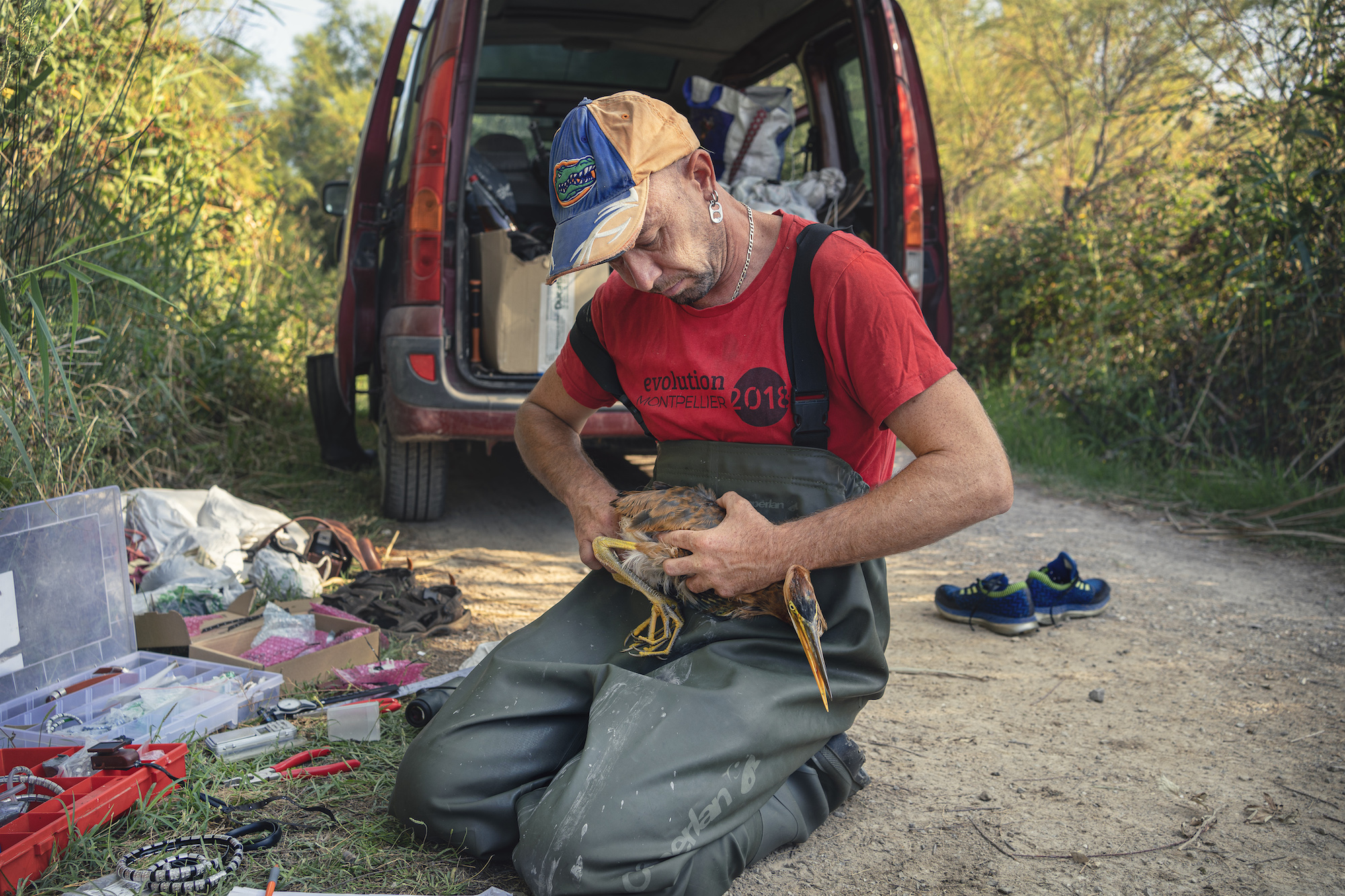 France, Vauvert, 2023-07-13. Un ornithologue bague un heron pourpre dans la reserve naturelle de Scamandre dans le Gard, dans le cadre du projet Migralion qui permet de mesurer le flux migratoire de la faune volante au dessus de la mer mediterannee et l impact dans le developpement de projets eoliens offshore. Photographie d Idriss Bigou-Gilles.