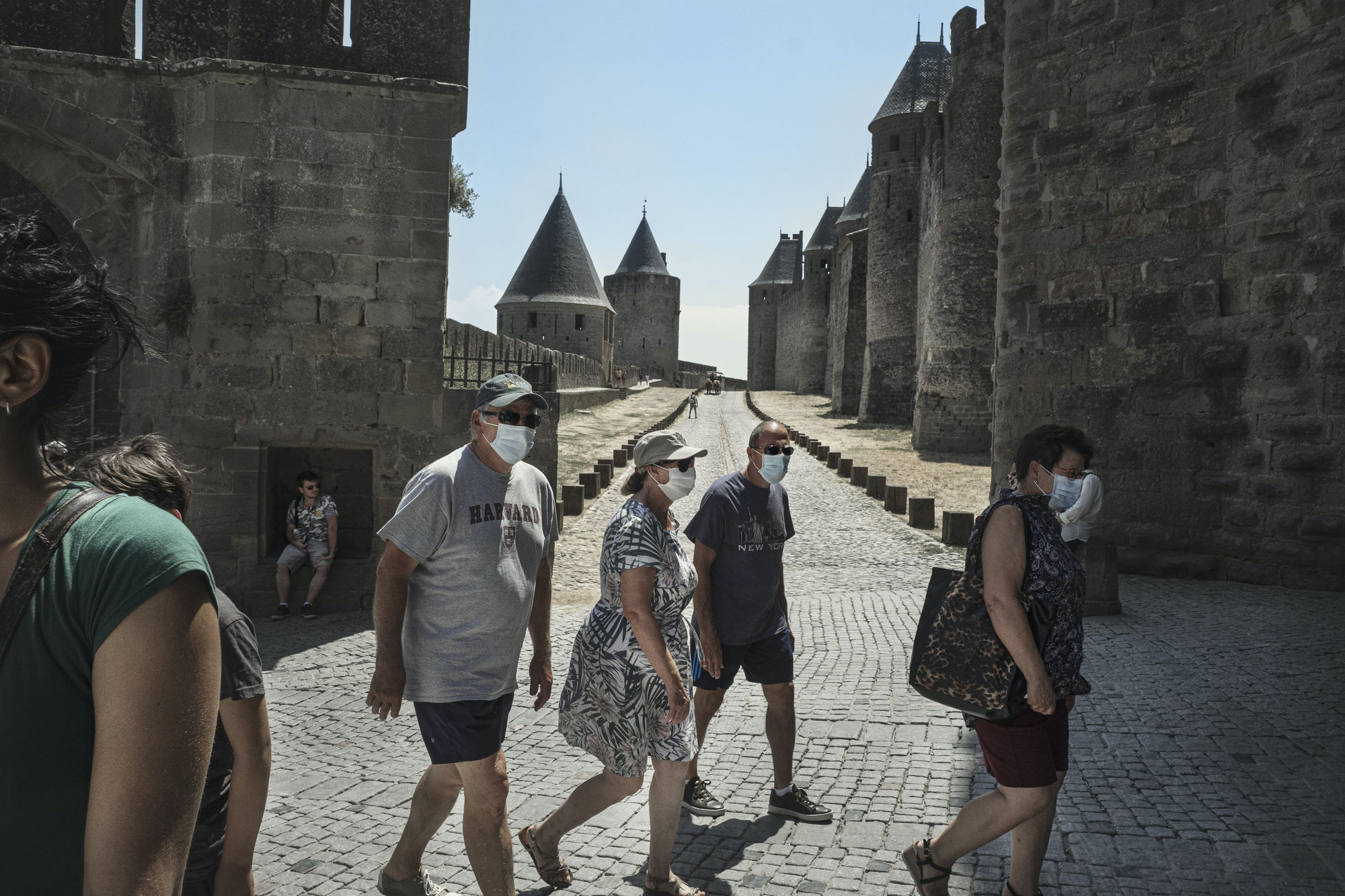 Des touristes portant un masque rentrent dans la cite de Carcassonne.