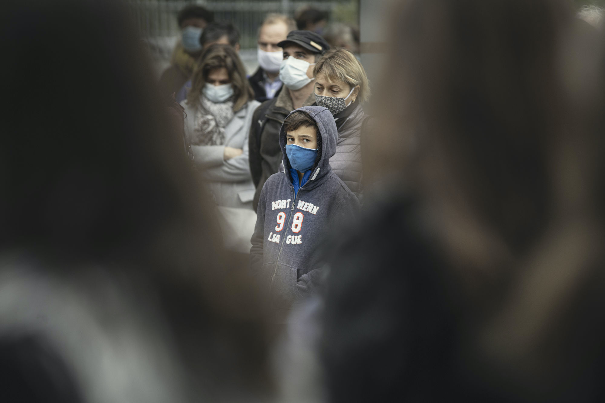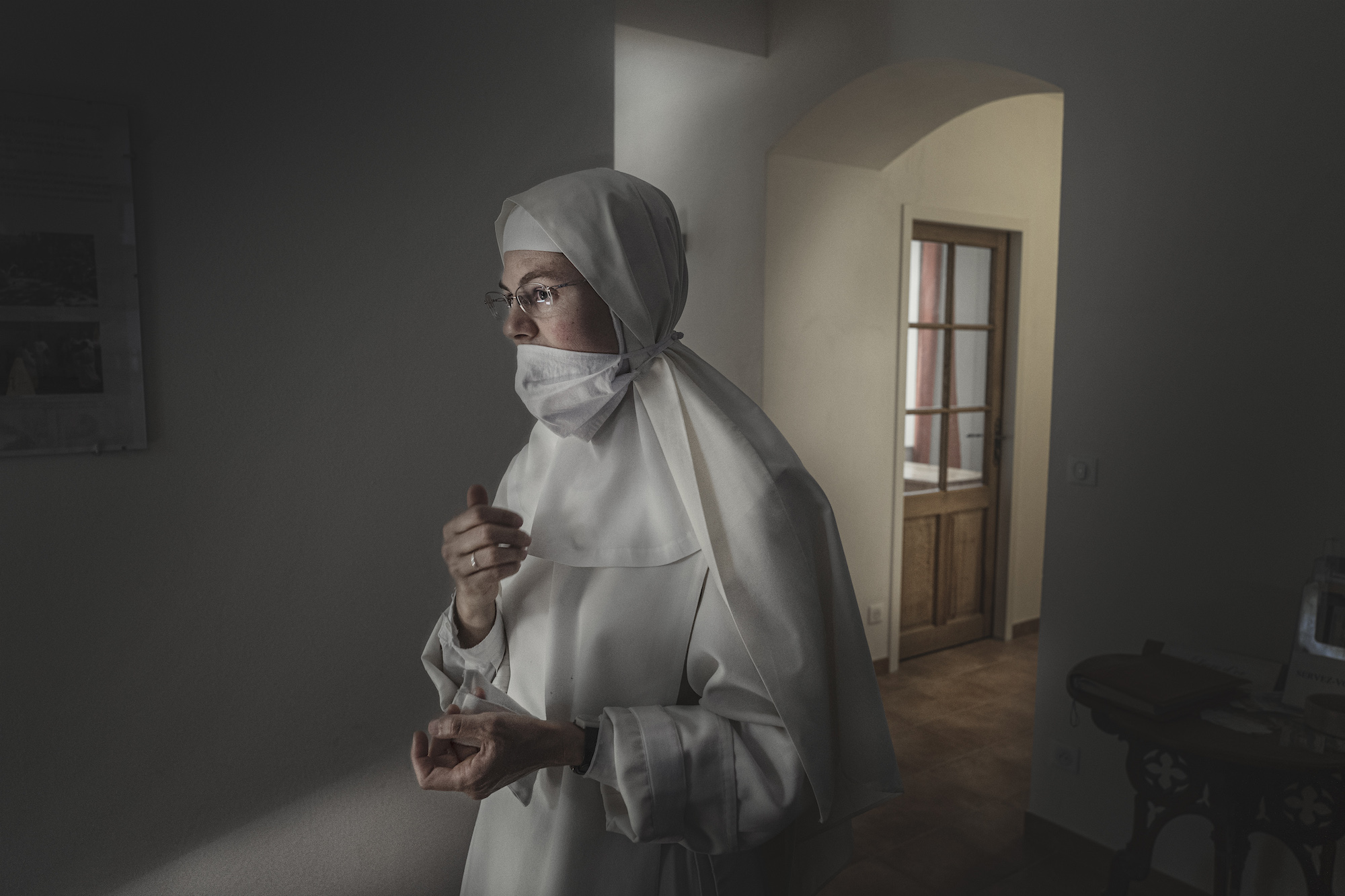 Une sœur du monastere des chanoinesses de la Mere de Dieu porte un masque pour accueillir les personnes venant de l’exterieur.