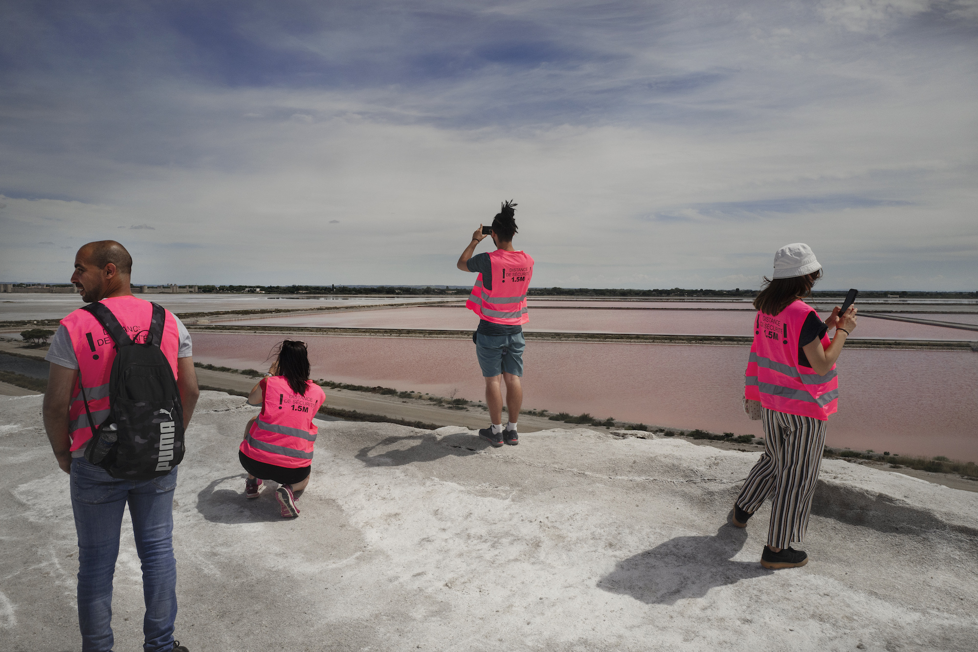 Des touristes prennent des photos dans les Salins d'Aigues-Mortes.