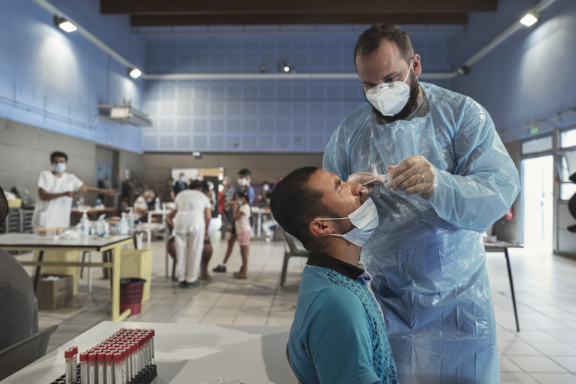 Un homme réalise un test viroligue, PCR, au centre social du quartier du Viguier a Carcassonne.