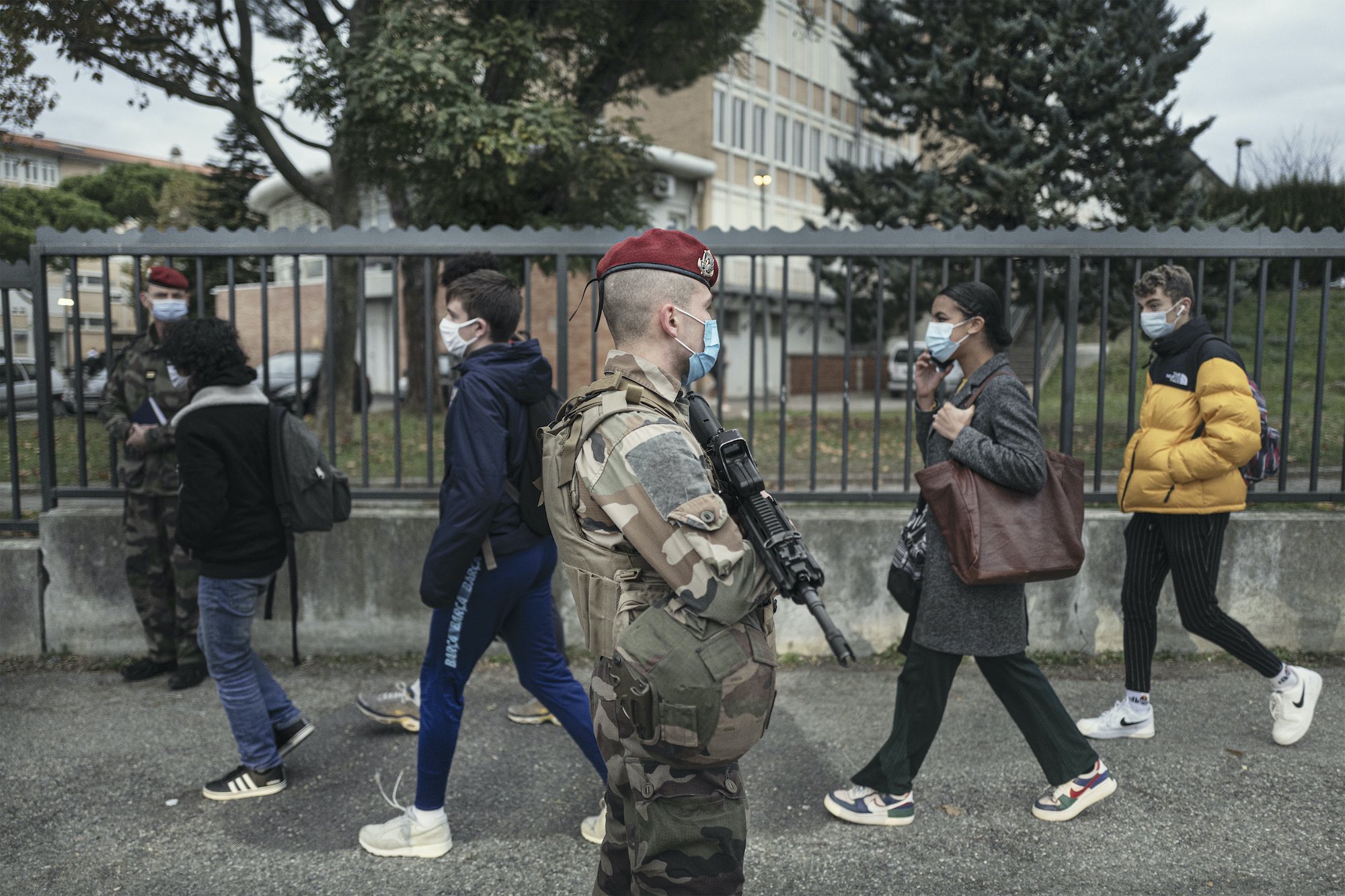 Des militaires de la patrouille sentinelle du 3eme RPIMA de Carcassonne sont positionnes devant le lycee Jules Fil à Carcassonne.