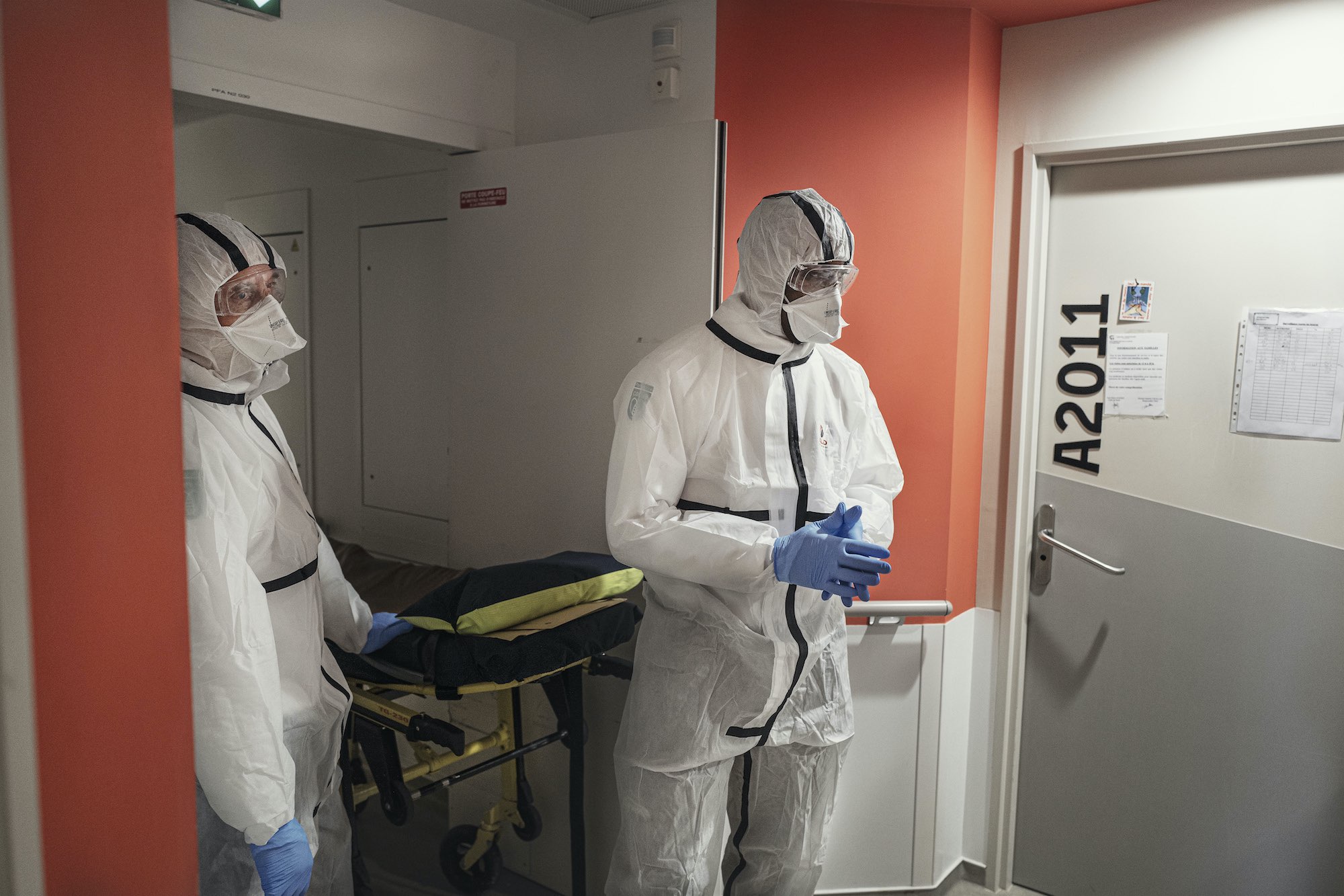 Dans un service dedie aux malades du coronavirus durant le reconfinement en France, deux ambulanciers viennent chercher un patient guerit du covid 19.