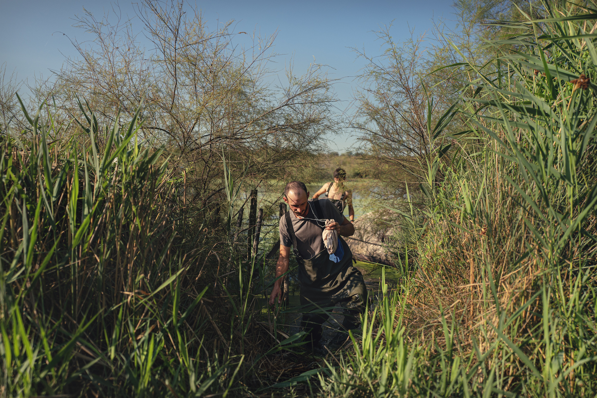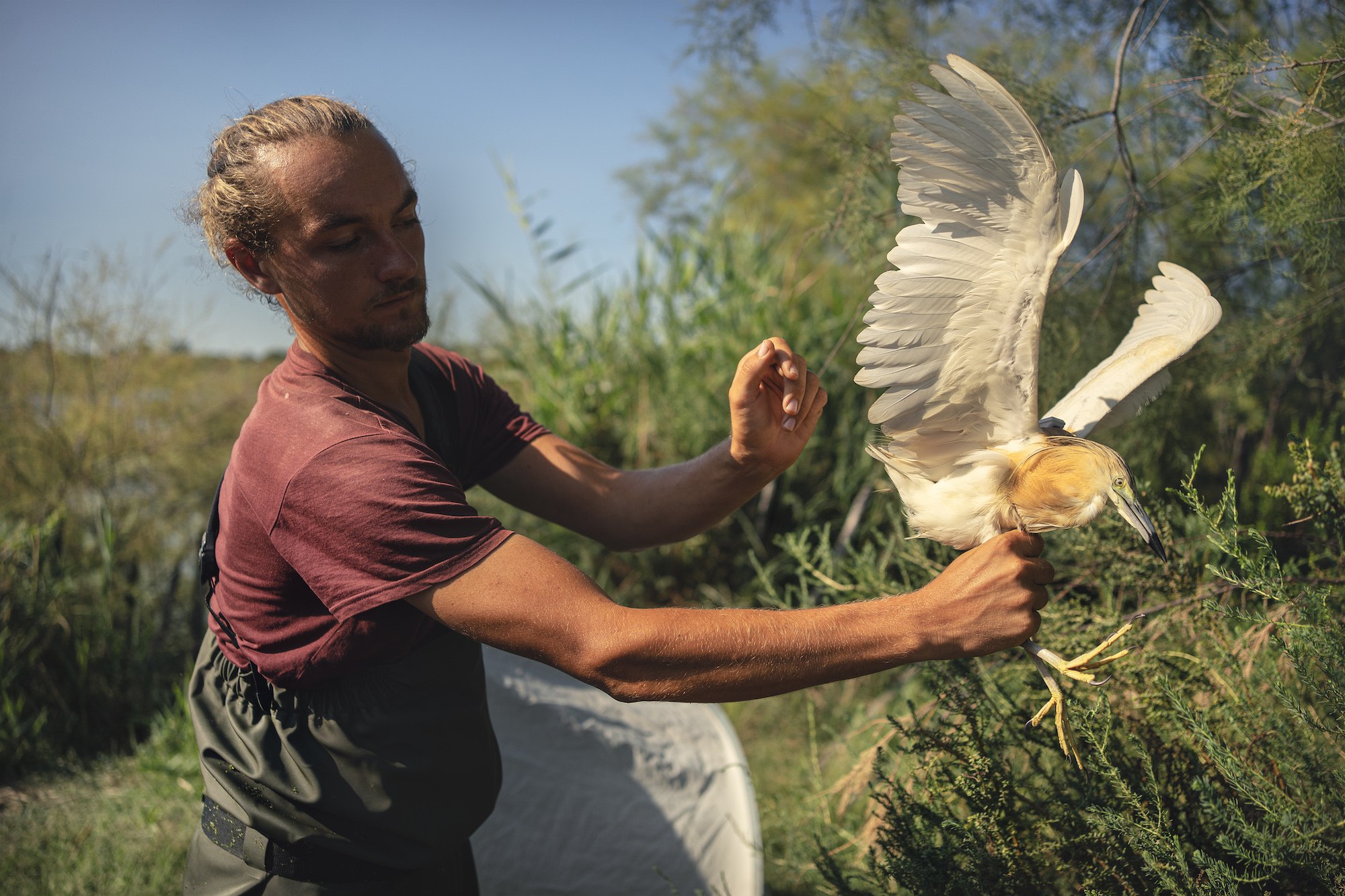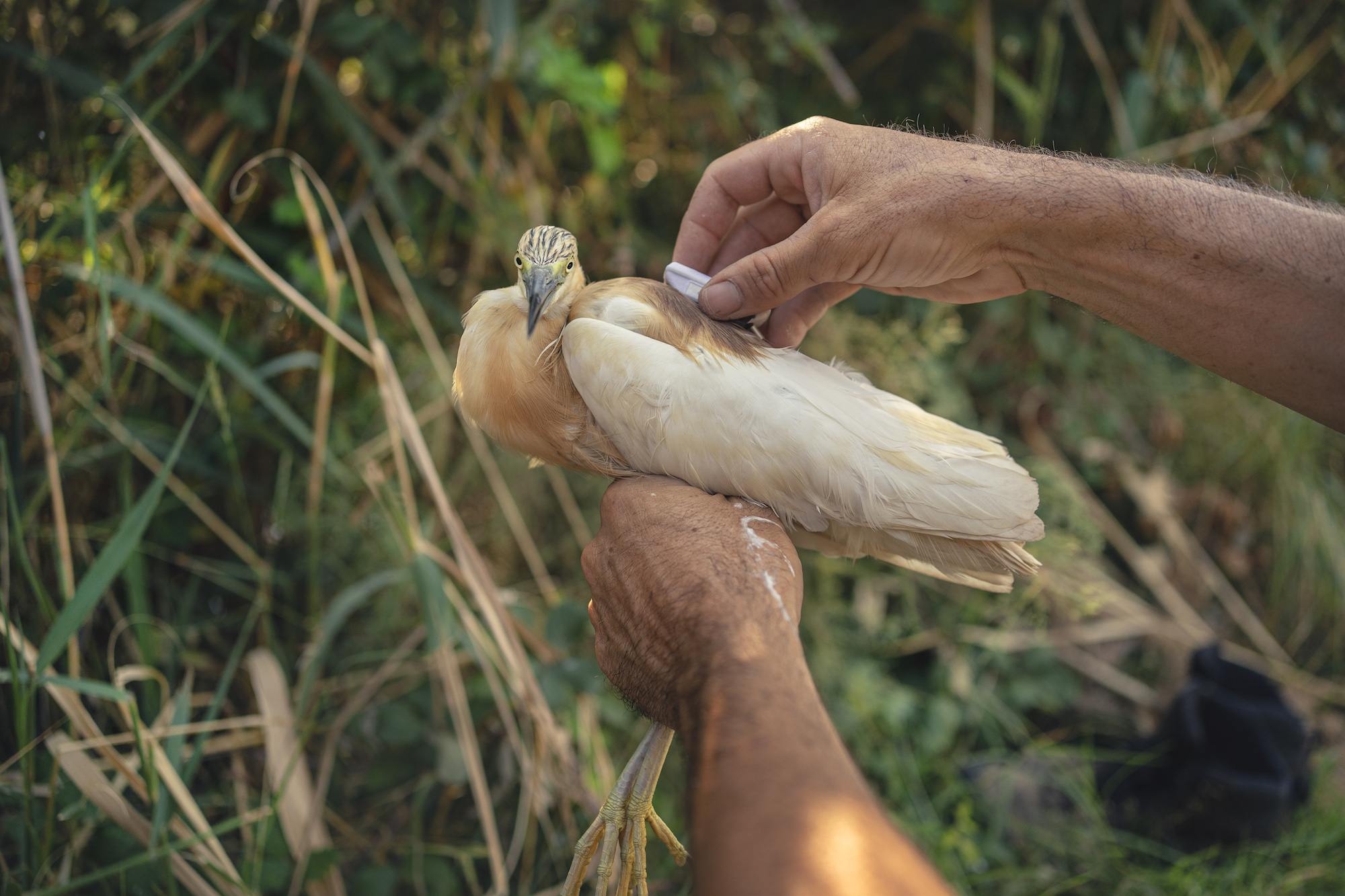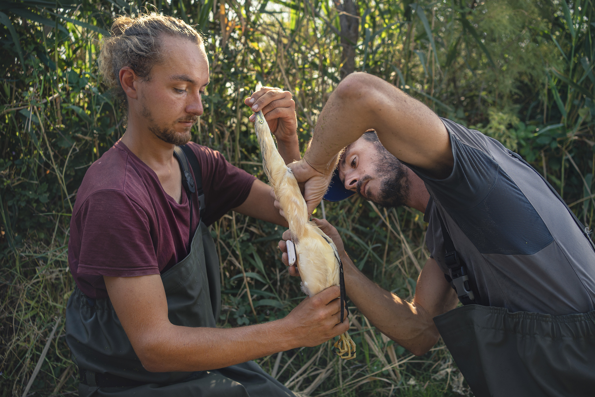 pose de balises GPS sur des oiseaux migrateurs protégés par des ornithologues de la Tour du Valat dans la réserve naturelle de la Scamandre en Camargues.