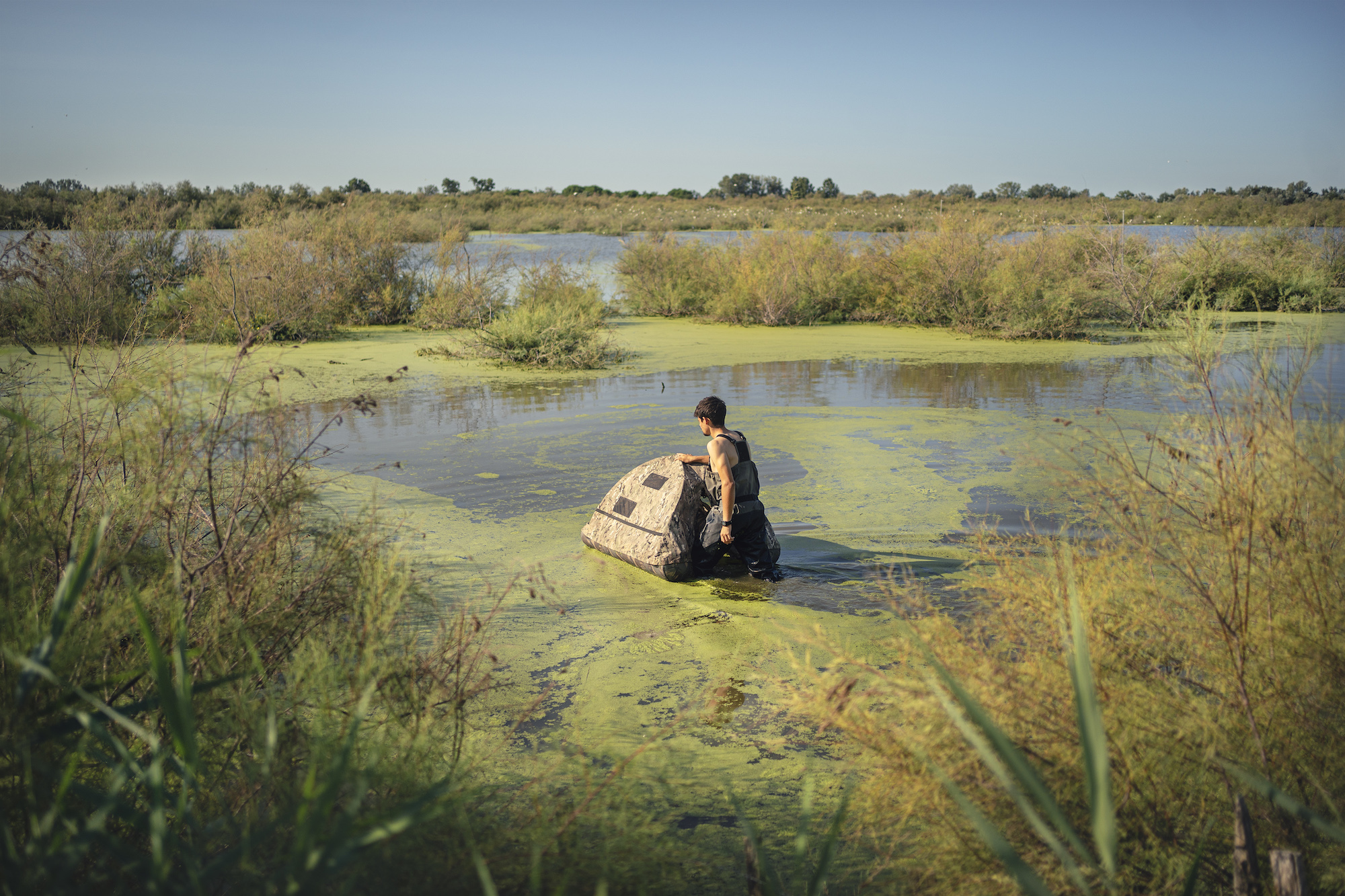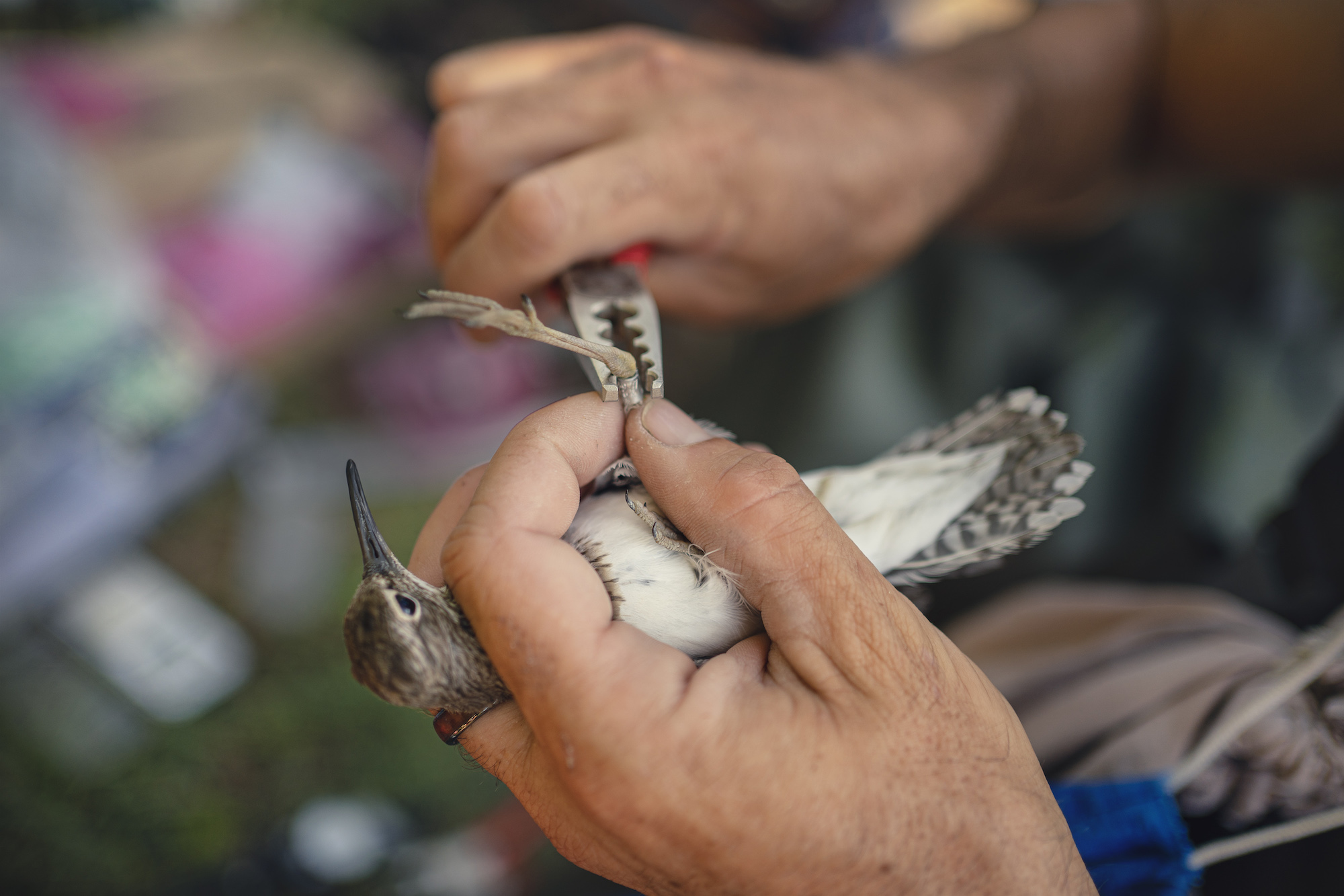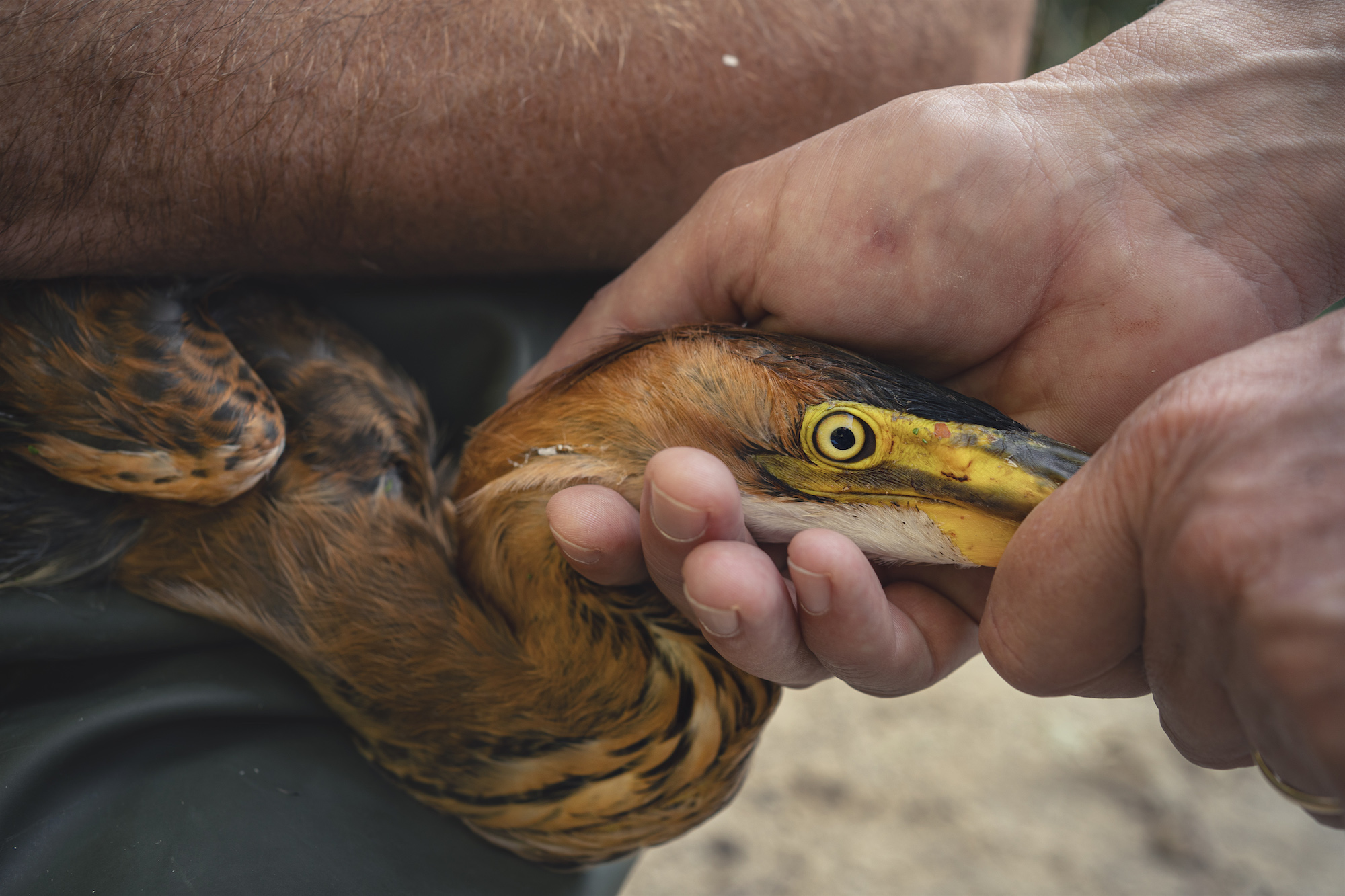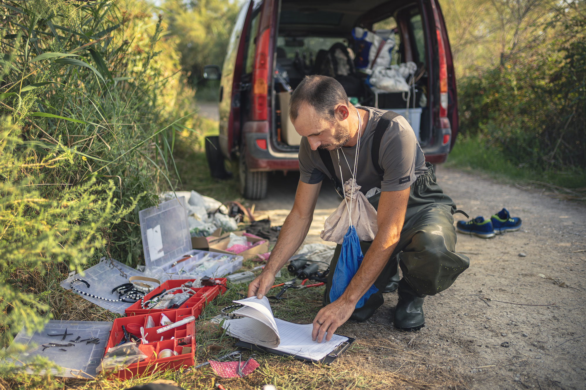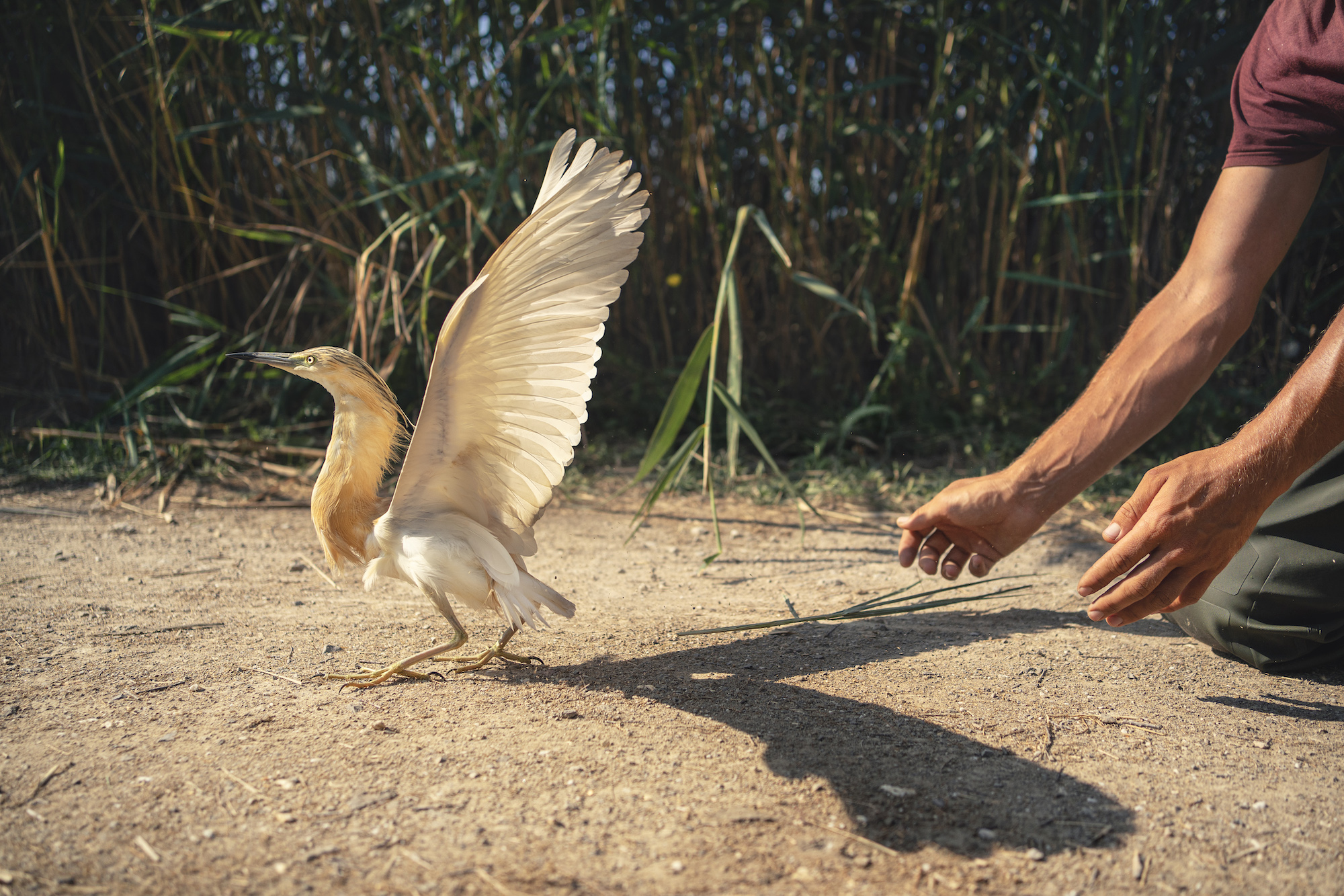 pose de balises GPS sur des oiseaux migrateurs protégés par des ornithologues de la Tour du Valat dans la réserve naturelle de la Scamandre en Camargues.
