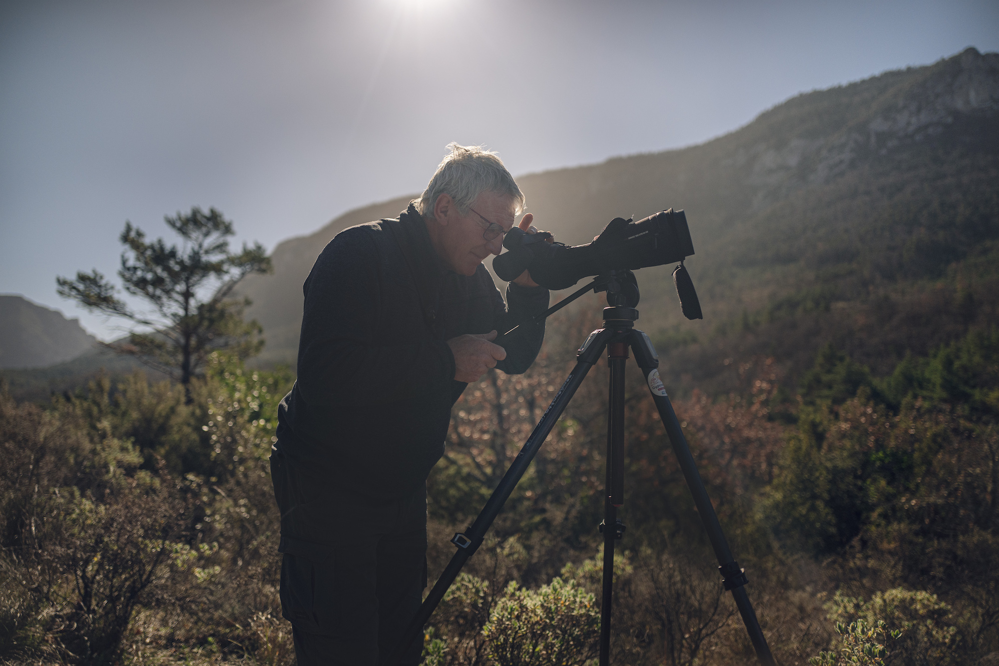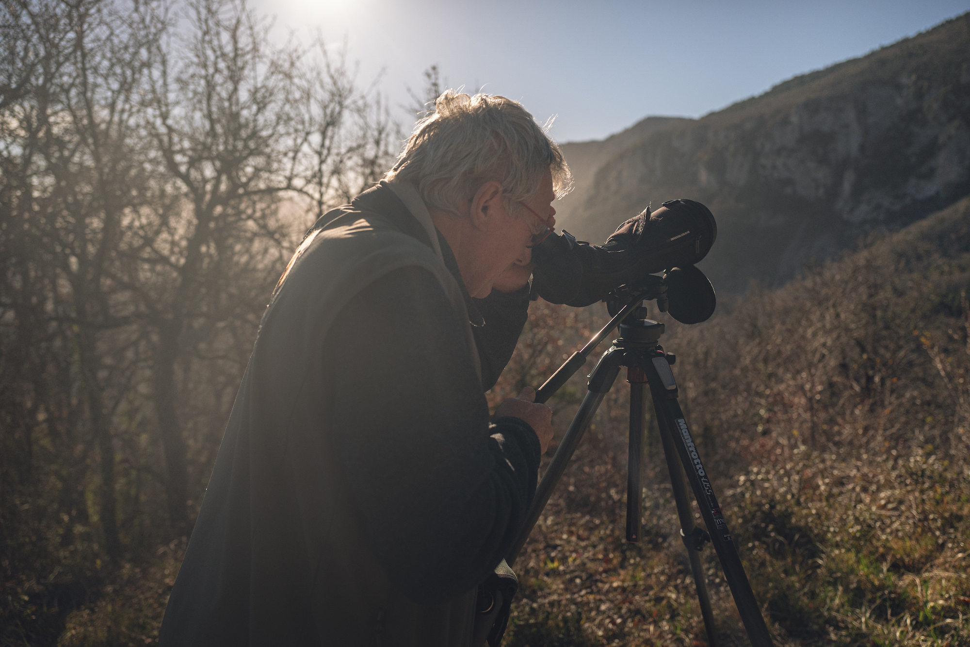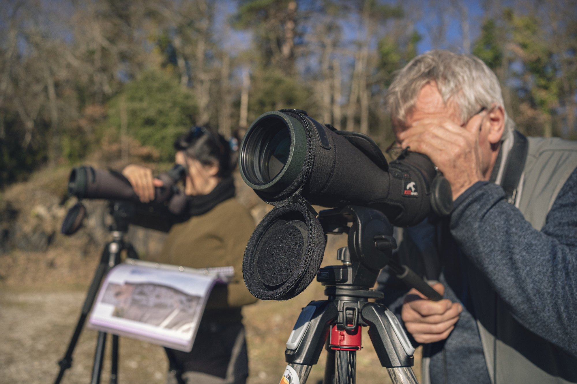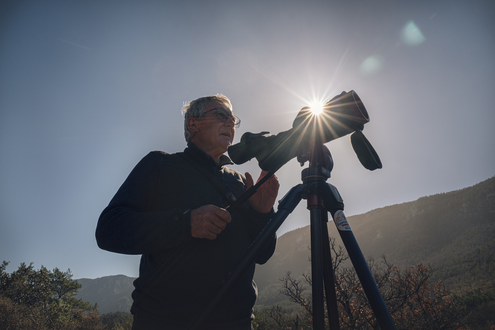 Deux membres de la LPO (Ligue de Protection des Oiseaux) de l’Aude réalisent un comptage de la nidification de vautours fauves à la sortie de l’hivers à Quillan dans l’Aude.