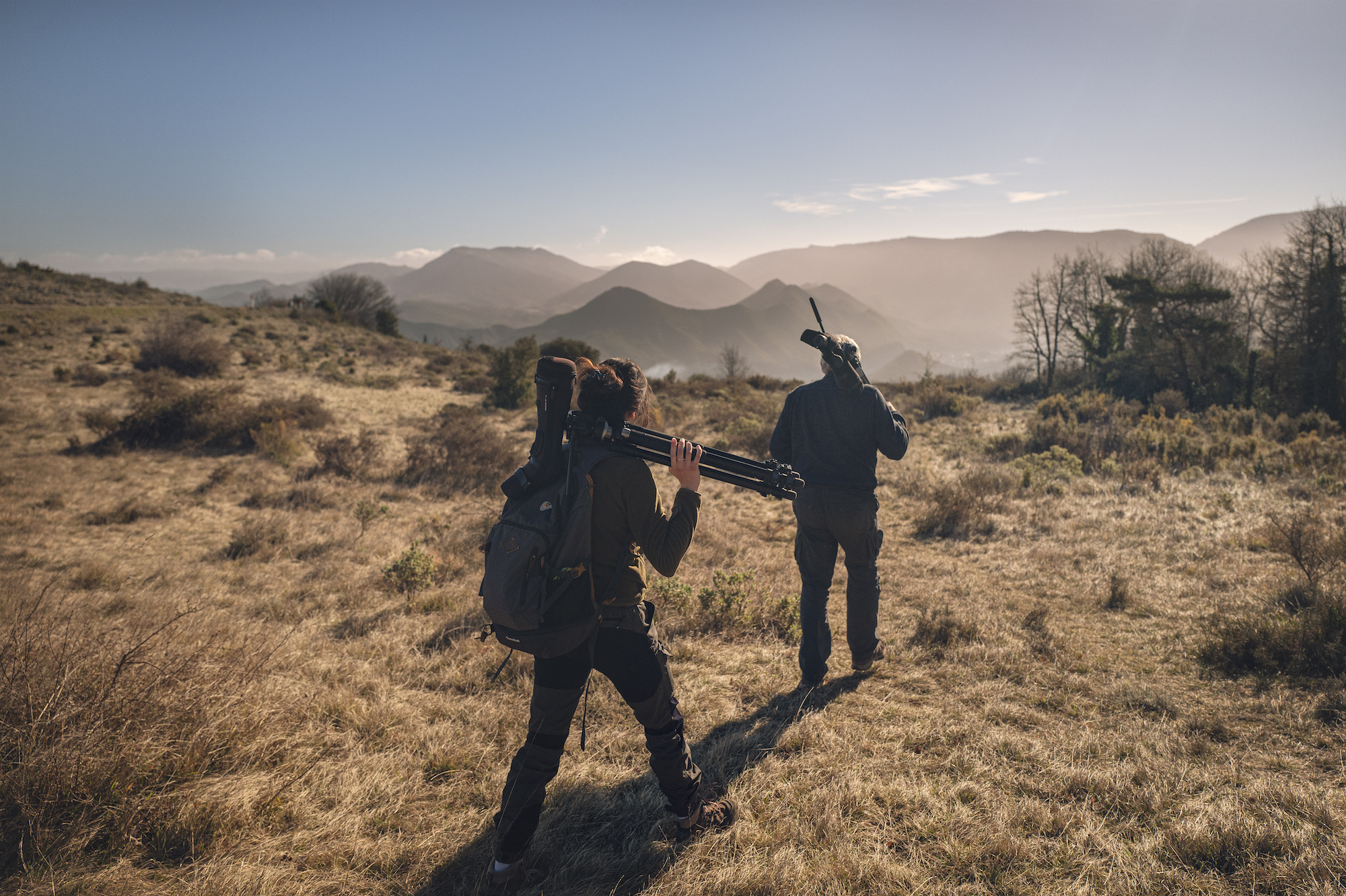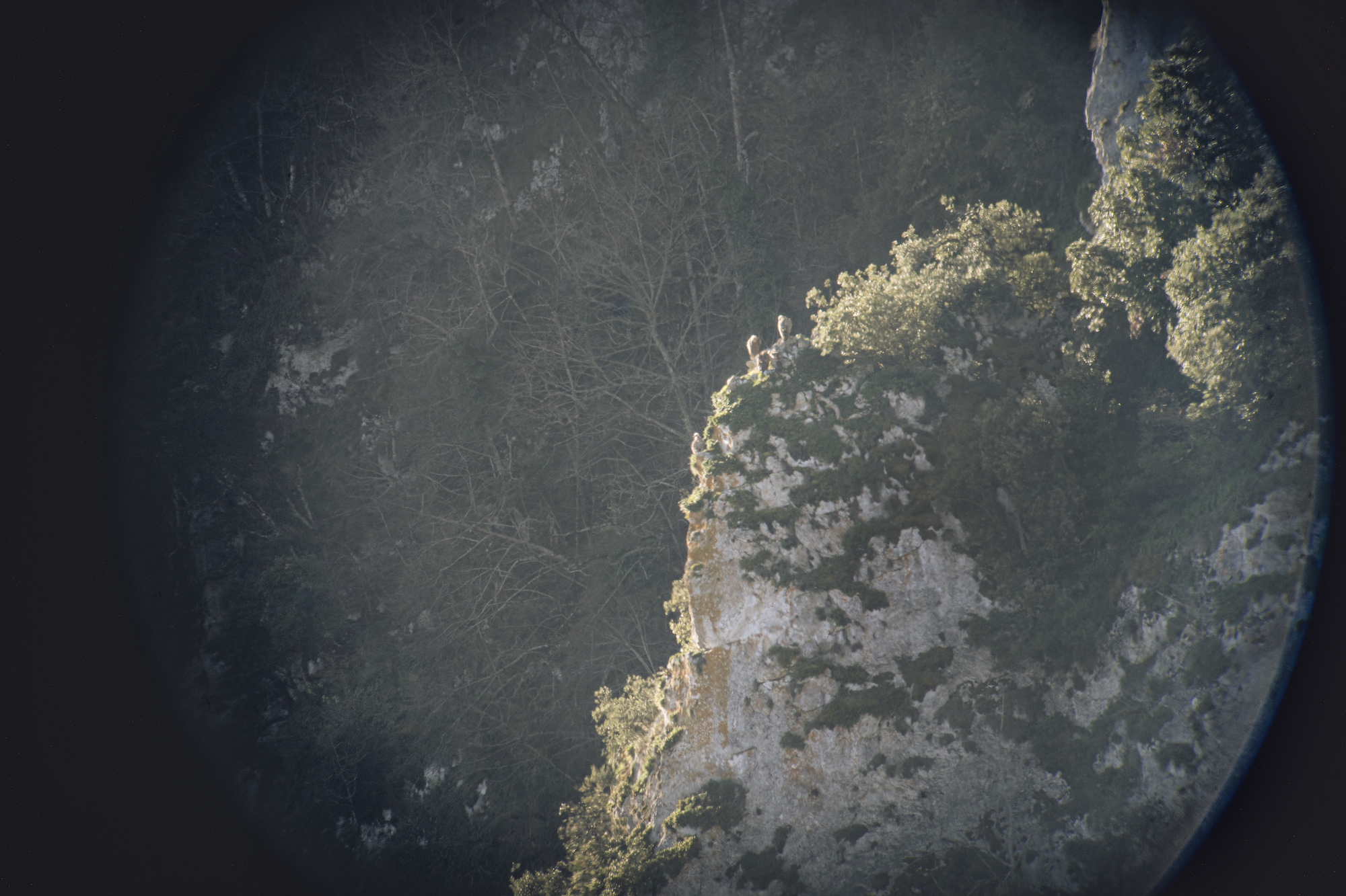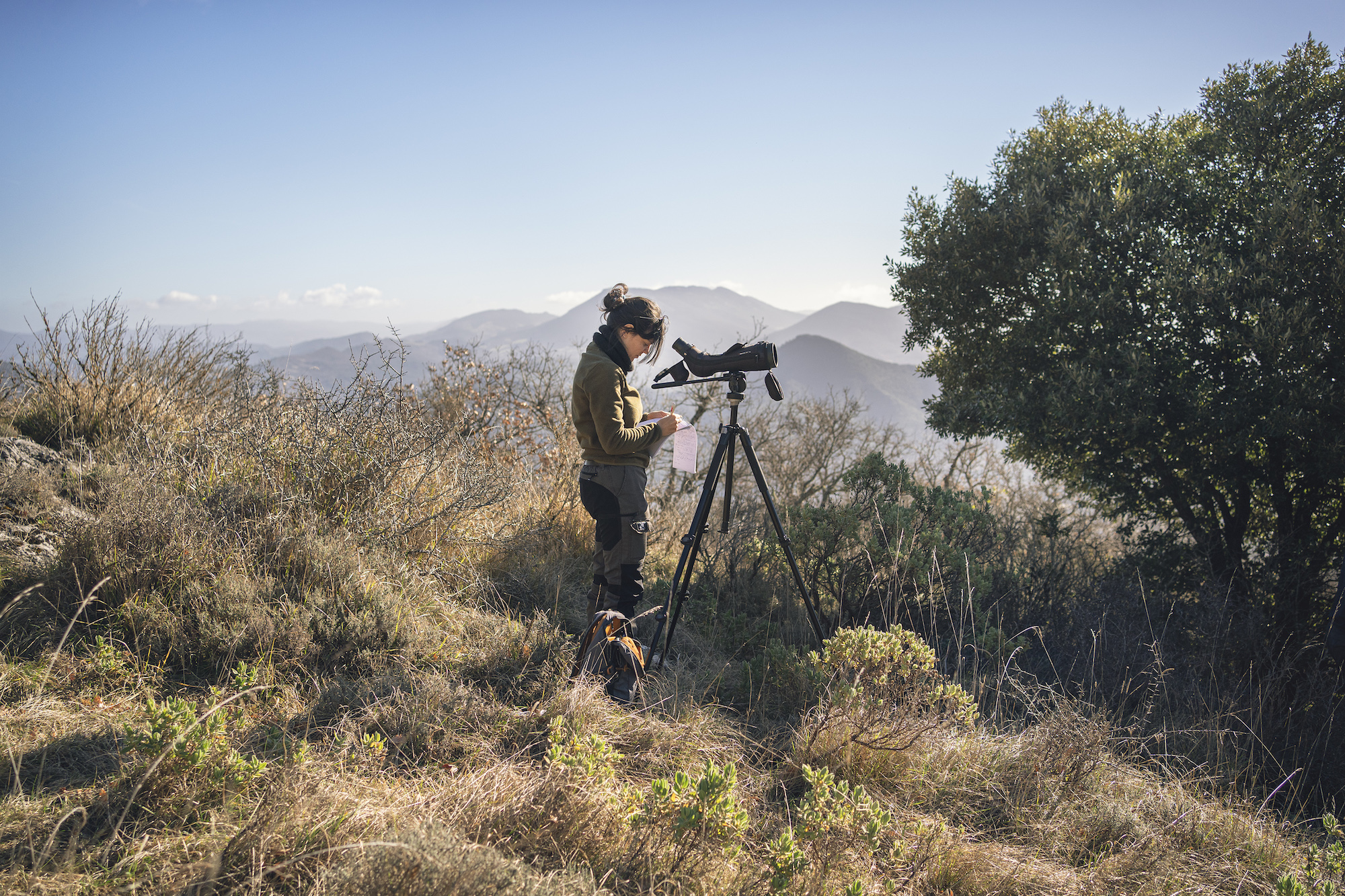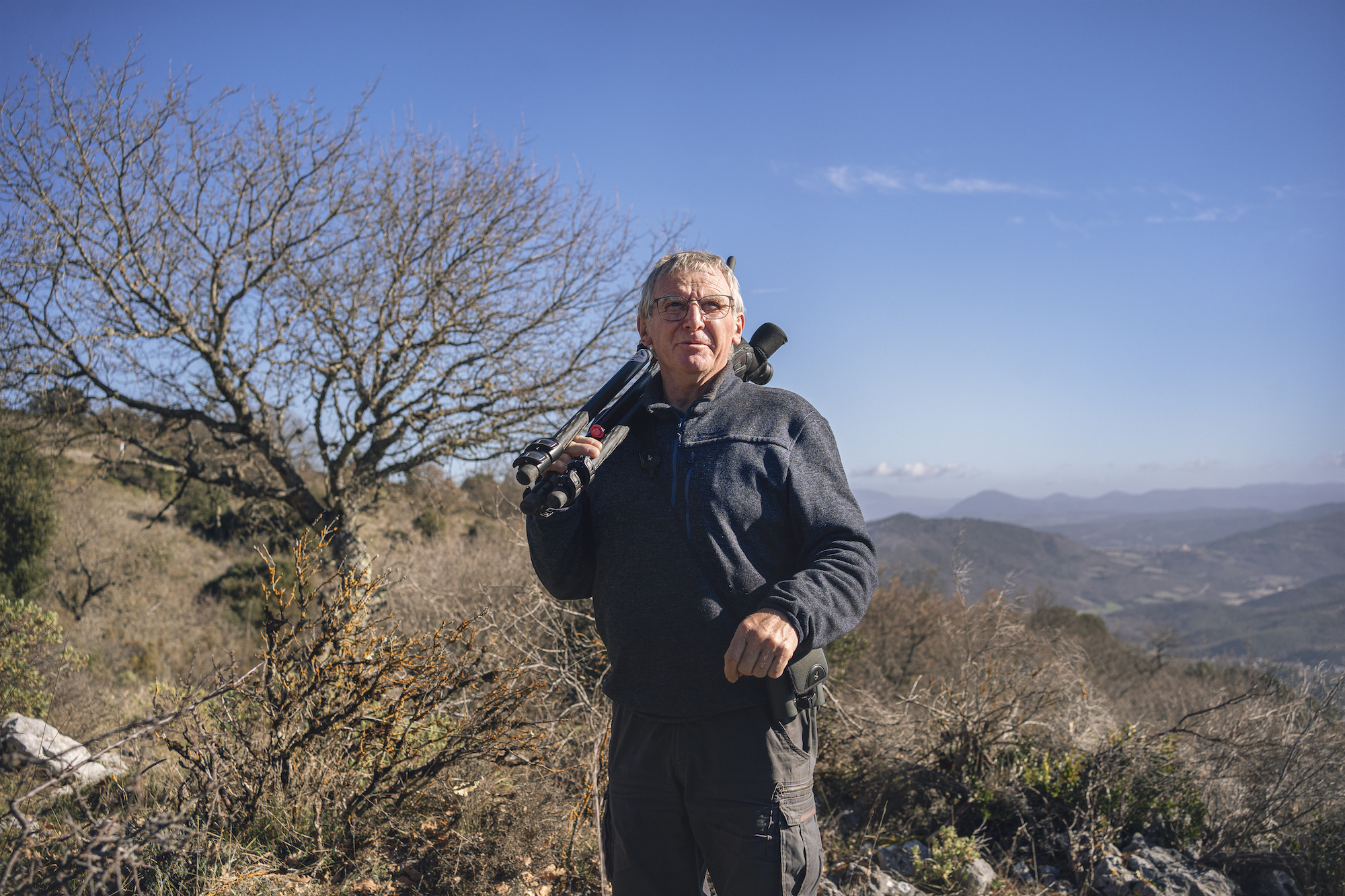 Deux membres de la LPO (Ligue de Protection des Oiseaux) de l’Aude réalisent un comptage de la nidification de vautours fauves à la sortie de l’hivers à Quillan dans l’Aude.